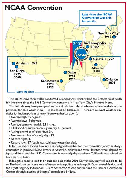 In some cases, the effort will be similar to the measures that member institutions already have taken in the wake of the September 11 attacks. Several NCAA championship finals are held on the campus of a participating institution, and in such cases, the NCAA is relying on those sites to keep doing what they have been doing to establish a heightened sense of security. Likewise, predetermined sites are being advised to use the extra planning time wisely.