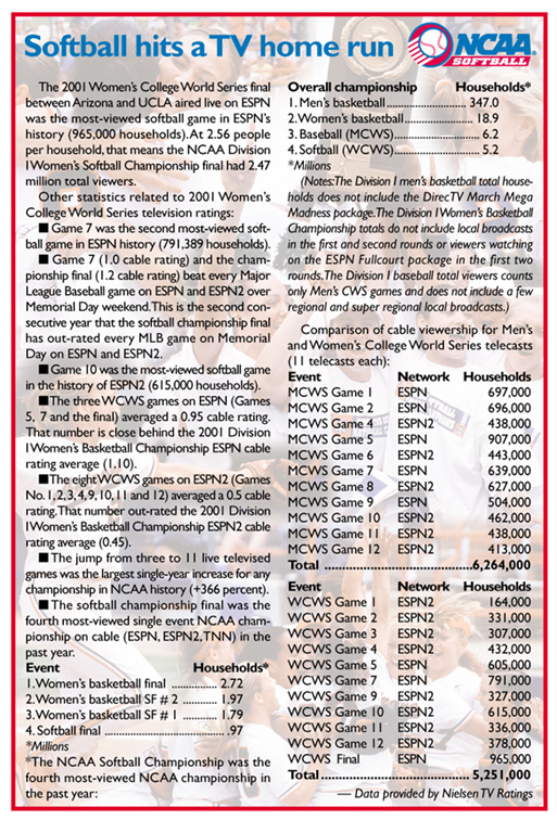ESPN and the NCAA have reached an 11-year agreement for broadcasting rights to the Division I Women's Basketball Championship. The agreement will run through 2013. The contract, which was announced July 5, also grants ESPN television rights for 20 other championships.