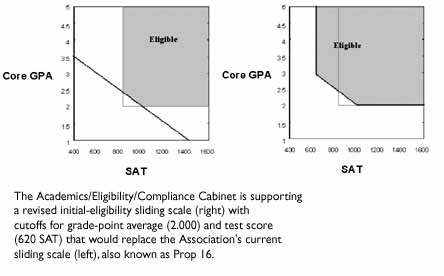 As for initial eligibility, the proposal would increase the number of core courses required from 13 to 14, maintain the cutoff on the current sliding scale for grade-point average at 2.000 and move the cutoff on the current sliding scale for test score to 620 SAT/52 ACT. (The cabinet favored this over a proposal that would establish a full sliding scale for both grade-point average and test score, and another that would establish a cutoff only for the grade-point average.) This would eliminate the current partial-qualifier category.