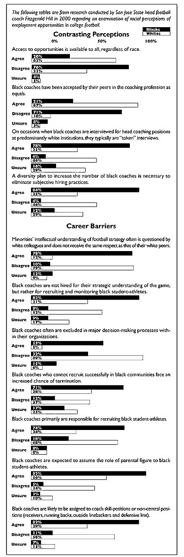 Hill's research is extensive. Two surveys, one in 1995 and another in 2000, examined racial perceptions of employment opportunities from majority and minority perspectives. What Hill discovered was that for the most part, white respondents felt there was equal access, while Blacks disagreed. There also were contrasting perceptions when it came to advancement opportunities and job placement. For example, most black respondents said black coaches are hired not for their strategic understanding of the game, but for recruiting and monitoring black athletes. Not surprisingly, a majority of white respondents disagreed with that notion.