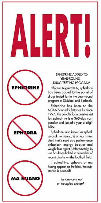 The NCAA banned the use of ephedrine, including ephedra and ma huang, in 1997 in order to address the reported use of the supplement by student-athletes who sought a competitive advantage. Ephedrine also recently was added to year-round testing, which means all student-athletes will be subject to ephedrine testing.