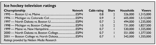 Those games make for great television. ESPN and ESPN2 have televised the Men's Frozen Four since 1985, and during contract discussions earlier this year, the event was a priority for the sports cable network. ESPN reaches 86 million households in the United States, while ESPN2 is shown in 82 million.