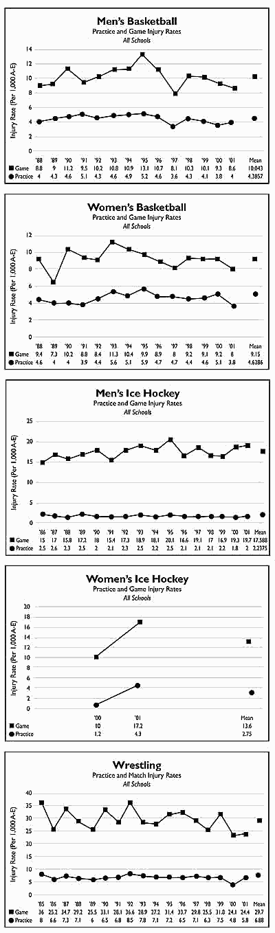 Women's basketball also had practice (3.8) and game (8.0) injury rates that were slightly lower than the 14-year averages for the sport. Assuming 10 game participants, the game rate equates to one injury every 13 games in the sport.