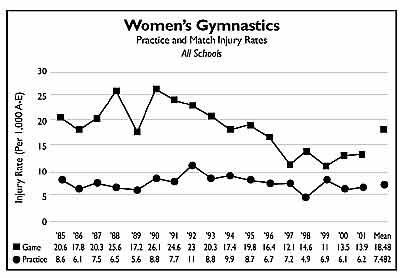 The 2001-02 women's gymnastics data show slightly lower practice (6.2) and meet (13.9) injury rates than the 17-year averages for the sport. Assuming eight game participants, the game rate equates to one injury every nine meets in the sport. The ankle, knee and foot were the most common body parts injured in practice, accounting for 40 percent of reported injuries, while the knee, ankle and head accounted for 62 percent of the reported injuries in meets. Sprains, strains and contusions were the top three types of injuries.