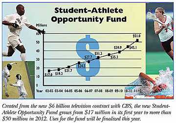 Some of that sum included increases to the existing Special Assistance Fund and Academic Enhancement Fund. But the new TV rights contract also allowed a third fund to be created -- the Student-Athlete Opportunity Fund, beginning at $17 million in 2003 and increasing to $51 million in 2012 -- for the purpose of providing direct benefits to student-athletes.