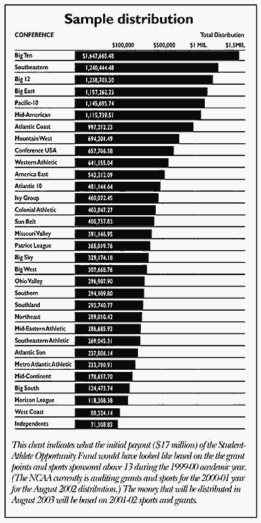 So far, all that's known about the Student-Athlete Opportunity Fund is that it can't be used to supplement staff salaries, capital improvements or countable grants-in-aid, restrictions that were placed early on. How it will be distributed also is known. Dempsey and other NCAA leaders recognized that it would be inappropriate to simply divide up the new fund and send it to schools, so NCAA and Collegiate Commissioners Association representatives agreed that the funds would be distributed through conferences with amounts allocated based upon the broad-based formula (sports sponsorship and grants-in-aid) beginning in August 2003.