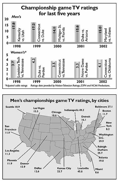 Television ratings for the event were similar to last year. The championship game between the University of Maryland, College Park, and Indiana University, Bloomington, drew a rating of 15.0, which was 0.6 point lower than 2001. The game peaked at a 16.2 rating before Maryland took control in the second half.