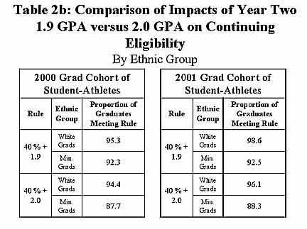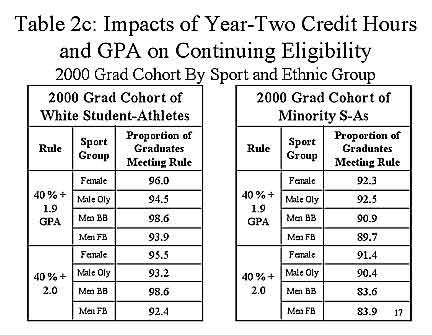 As for the continuing-eligibility proposals, concerns surround tougher requirements in the first two years, a period experts have deemed critical in identifying who will graduate and who won't. Some think the proposals calling for second-year athletes to have successfully completed 24 credit hours with a 1.800 grade-point average and then 40 percent of degree requirements with a 2.000 GPA by the start of the third year are too stiff. Though basketball coaches have been the most outspoken in that regard, even the Board wondered recently whether a softer second-year GPA requirement would be more feasible.