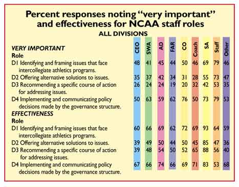 One set of questions related to the importance of the staff "identifying and framing issues that face intercollegiate athletics." Of the responding staff members, 79 percent said it was "very important" for the staff to meet that responsibility. The membership, however, saw the issue differently; of the athletics administrators who were surveyed (CEOs, senior woman administrators, athletics directors, faculty athletics representatives, conference commissioners and coaches), not more than 50 percent of any subset said it was "very important" for the staff to identify and frame issues.