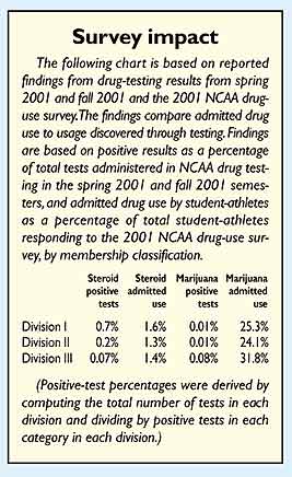 Those grades generally have been good. The percentage of respondents acknowledging use of anabolic steroids fell from a high of 4.9 percent in that 1989 survey to under 1.5 percent in the last two surveys (although a slight increase in the 2001 results is helping feed recent concern about use of dietary supplements by student-athletes).
