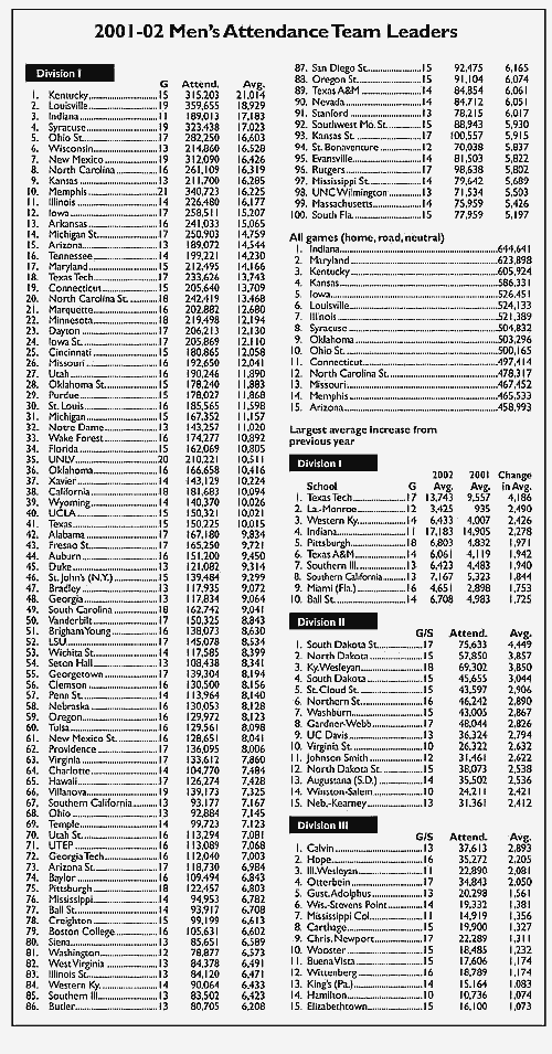 Twenty-six Division I teams realized an increase in attendance of more than 1,000 fans per home game from the previous year. New coach Bob Knight helped attract Texas Tech fans, as 4,186 more people per game crowded into United Spirit Arena. Three other schools with a 2,000 or more increase were Louisiana-Monroe (up 2,490 fans a game), Western Kentucky (2,426) and Indiana (2,278).