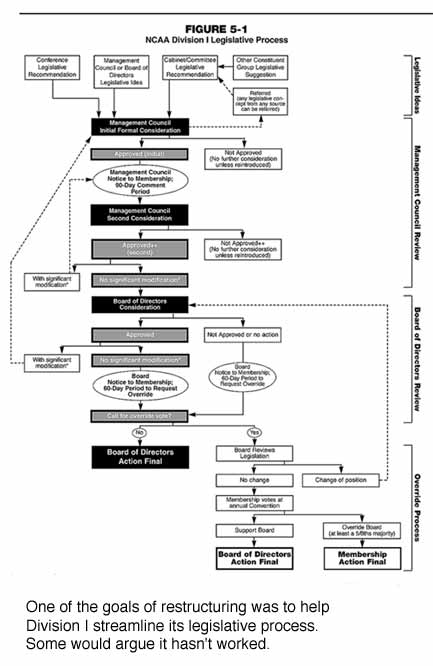 One of the governance subcommittee's proposals is to do just that. The proposal suggests that Management Council and Board members would continue to meet quarterly and process the legislative "minutia" or noncontroversial proposals that gain at least a 75 percent majority. The other proposals -- presumably those that are larger in scope, such as amateurism deregulation, basketball reform or the academic-enhancement package, for example -- would be sent to the Division I membership in the form of an official notice, much like what used to be distributed before Convention. The notice would include a description of the issues at stake and a summary of the noncontroversial legislation adopted during the year.