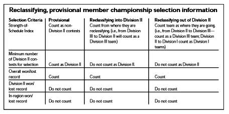 Determined how provisional and reclassifying members would be treated in the championship selection process (see accompanying box). Additional information about strength-of-schedule indexes and selection criteria will appear in the September 2 issue of The NCAA News.