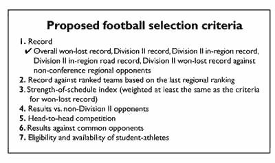 Noting that the selection criteria under consideration would reward an institution for scheduling quality Division II opponents, one football coach said, "With the changes, is it necessary to go to eight? We don't want to push some programs over the edge."