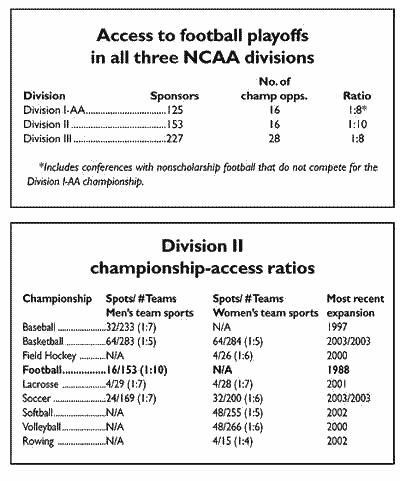 Division II football's ratio of playoff opportunities to sponsoring institutions is the highest by far of any Division II team sport. Only one of about every 9.5 sponsoring institutions qualifies for the football championship; the next highest ratio is 1:7. Three sports are 1:5 and one is as low as 1:4.
