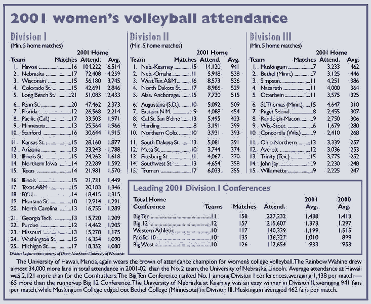 Women's attendance passed the nine million mark for the first time in 2001-02, the 18th consecutive record. National women's attendance jumped by more than 700,000, as 9,532,781 spectators flocked to the 2001-02 games, a record 6,937,813 of them in Division I.