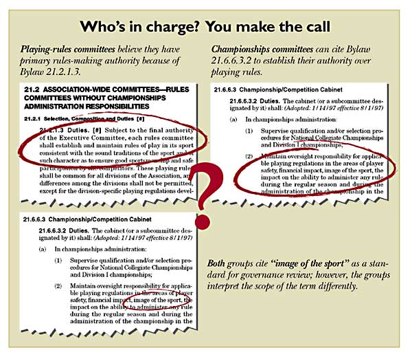 The situations in basketball and soccer raise the question of who has the final say when it comes to the rules of play. Cabinet members believe the buck stops with championships groups since they are the bodies to which rules committees report. Rules committees, though, are beginning to think their expertise is being micro-managed and, ultimately, undercut.