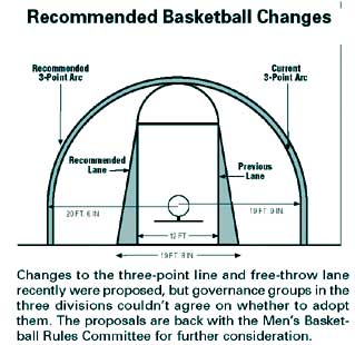 But the proposal encountered resistance, resulting first in action to scrap the wider lane and seek approval of the new three-point line only, then disagreement among the NCAA membership divisions over whether to adopt the three-point line by itself (with conflict also arising over related proposals in women's basketball).