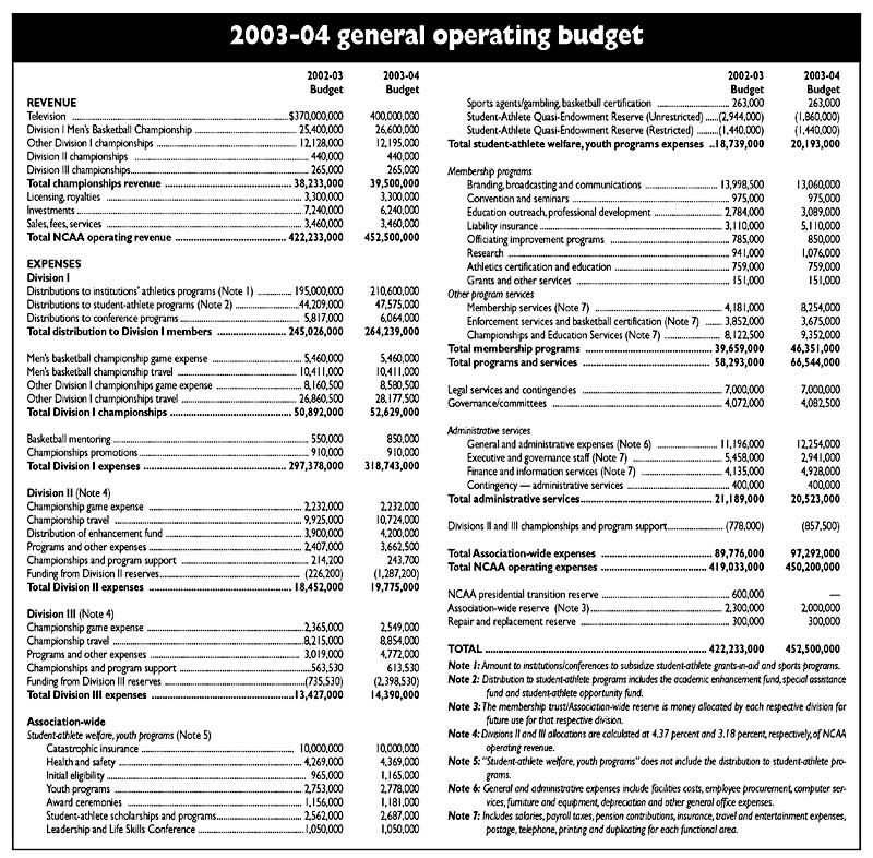 The 2003-04 budget of $452,500,000 reflects a projected increase in revenues of about 7.2 percent, or $30.3 million, primarily from the CBS Sports and ESPN television and marketing rights fees. Championships revenue is expected to increase by about 3.3 percent.