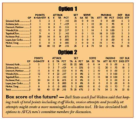 If he had it his way, box scores that he has drafted would replace the current one. One version counts setting and serving attempts and eliminates blocking assists and errors. Both versions have total points as the lead column. Walton hopes that whatever the outcome, the box score will be a better evaluation tool for the coaches and more media-friendly at the same time.
