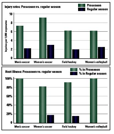 NCAA Injury Surveillance System data suggest that heat illnesses do occur in other sports that have a fall preseason and the general injuries rates in the preseason are higher for those sports as compared to the regular season. Student-athletes should be allotted the appropriate amount of recovery time between strenuous workouts in order to repair their bodies.