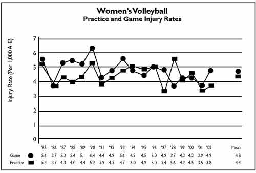 Women's volleyball is one of the few sports monitored that has game-injury rates that are similar to practice. The 2002-03 data show practice (3.8) and game (4.9) rates that were similar to the 20-year averages for the sport. Assuming eight game participants, the game rate equated to one injury every 25 games in the sport. The ankle, shoulder and knee were the most common body parts injured in practice, accounting for 43 percent of reported injuries, while the ankle, knee and shoulder accounted for 59 percent of the reported injuries in game competition. Sprains and strains were the top types of injuries.