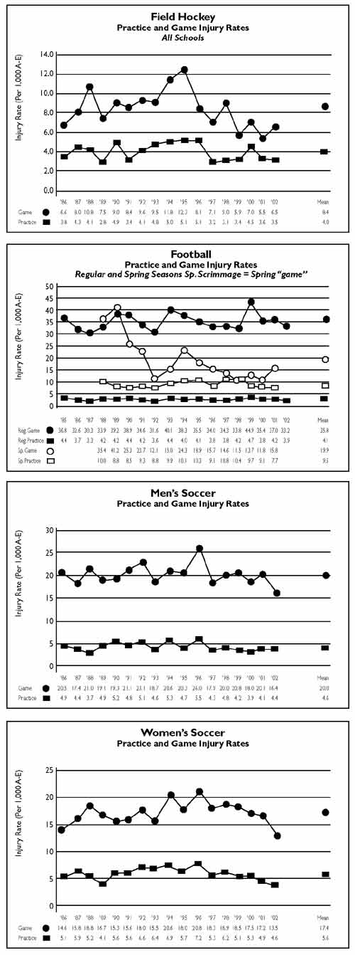 The 2002 report also showed, however, that head injuries in multiple sports, heat illness in football and player contact injuries in soccer are a concern.