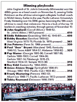 Gagliardi tied Robinson at 408 wins November 1 when St. John's rallied to a 15-12 victory on the strength of a 35-yard field goal with just eight seconds left in the contest against the University of St. Thomas (Minnesota).