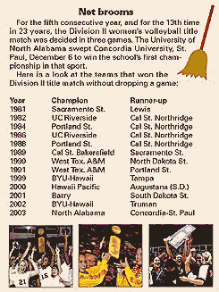 Hawaii Pacific wins its first Division II Women's Volleyball Championship. The victory comes in the Sea Warriors' first tournament appearance. Hawaii Pacific defeated North Dakota State University, 15-10, 8-15, 15-12, 16-14, to win the title.
