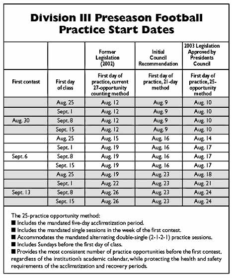 The revised method, subsequently approved by the Presidents Council, takes into account an institution's academic calendar as well as its first contest, while also accommodating the mandated five-day acclimatization period, mandated alternating double-single practice sessions and also single sessions in the week of the first contest. (See the accompanying chart to see how the first-contest date and first day of class fit with the first day of practice for several common start dates under the recently approved counting method vs. 2002 legislation.)