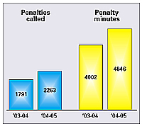 The issue has received a barrage of media attention, with critics suggesting the emphasis on enforcement has slowed down the game and resulted in more penalties. According to an NCAA analysis of penalties and penalty minutes comparing the first 121 games of the 2003-04 season to the first 111 games of this season, both figures are up significantly (see accompanying chart).