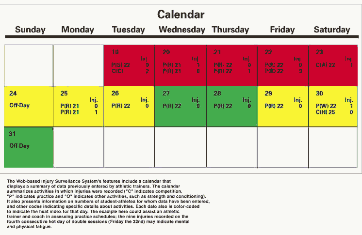 Another new feature is an individualized calendar that schools can generate online, indicating daily injury categories, status and even day-to-day climatic indicators useful in monitoring heat-related injuries and illnesses.