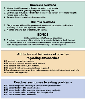 According to a recent survey Thompson and his partner, Roberta Sherman, conducted in conjunction with the NCAA, 37 percent of coaches believe amenorrhea, the cessation of menstruation, is normal. In actuality, amenorrhea is a serious medical problem and requires medical consultation. Amenorrhea is a key component in the female athlete triad, which also includes disordered eating and osteoporosis. The three conditions often are related and found in the same student-athlete.