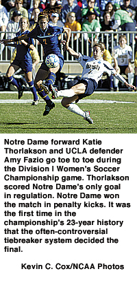 Penalty kicks played a deciding role in Notre Dame's second Women's College Cup victory December 4 at SAS Soccer Stadium in Cary, North Carolina. After Notre Dame goalkeeper Erika Bohn turned away a penalty-kick attempt late in regulation, she made another deflection to seal Notre Dame's 4-3 advantage in the penalty-kick tiebreaker.