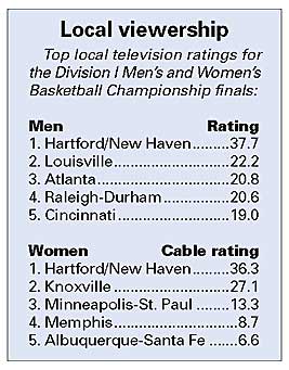 Some local viewership figures for the women's tournament were huge. At the high point of the championship game, the women's final attracted an audience share of 50 (36.3 rating) in the Hartford, Connecticut, market. That compared favorably with the peak share of 54 registered the previous night for the Hartford market for the men's final between Connecticut and Georgia Tech.
