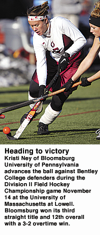 Bentley pushed defending national champion Bloomsburg to overtime but fell short as the Huskies claimed their third straight NCAA Division II Field Hockey Championship November 14 at Massachusetts-Lowell's Cushing Field.