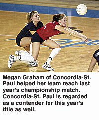 Championship notes: Nebraska-Kearney's Erin Brosz is ranked third nationally in hitting percentage at .444. As of October 28, Nebraska-Kearney was 28-0 and tied the 1981 team for the second-longest win streak in school history. The only longer streak was 39 victories in a row during the 1990s ... UC San Diego's Teresa Ohta averages 13.01 assists per match, which helps her team rank seventh nationally in that category ... Truman's strength is balance. No player ranks nationally in the top 30 in any individual category, but Truman is 28-0 as of October 28 ... Concordia-St. Paul ranks second in blocks per match at 3.47, and was the national runner-up in 2003.