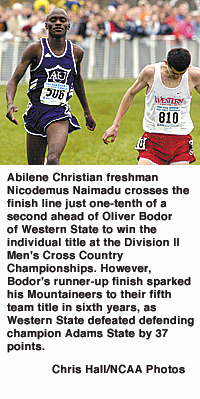 Kelly Christensen of Western State, who won every previous meet he ran in this year, also kept pace with Naimadu and Bodor over most of the muddy course November 20 at Southern Indiana, before dropping back slightly to finish third, less than 14 seconds behind. Also scoring for the Mountaineers were Will Banks in sixth, Tim Parr in 12th and Scott Swearingen in 16th place.