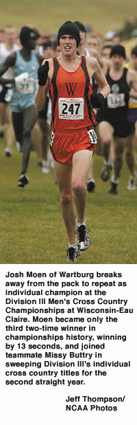 Individual competition also featured a repeat winner, as Wartburg's Josh Moen became only the third man to win two straight Division III titles. He joins Dale Kramer of Carleton and David Terronez of Augustana (Illinois) as two-time titlists.