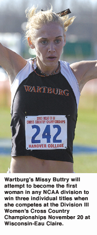 Championships notes: This year's meet may be a celebration of out-of-the-ordinary streaks, as three rivals from the New England Small College Athletic Conference (Williams, Amherst and defending champion Middlebury) again will be in the thick of competition to bring home a fifth straight team title for the league ... However, eyes will be focused on senior Missy Buttry from Wartburg, who is vying to become the first three-time individual winner in women's cross country in any division. Buttry dominated the field in her first two victories, but one of her chief rivals, Wisconsin-Oshkosh senior Liz Woodworth, also returns with hopes of snaring a crown, both individually and with her team ... The three NESCAC rivals also are led by individual contenders, including Amherst's Carter Hamill and Shauneen Garrahan, Williams' Caroline Cretti (who missed last year's race with an injury) and Jenn Campbell, and Middlebury's Jess Manzer. Wisconsin-Stevens Point could crash the party, however, behind junior Jenna Mitchler and senior Megan Craig.