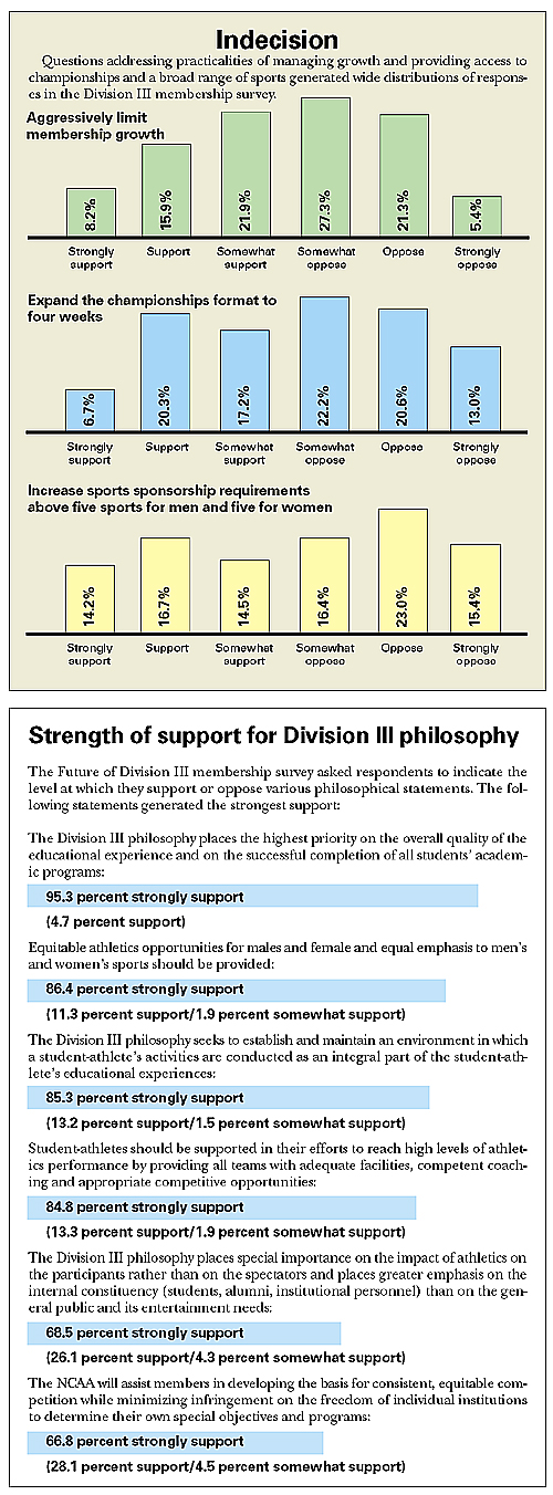 Although other survey results indicate differences among members about how to deal with a variety of practical matters, they also seem to indicate significant support for at least maintaining the current Division III structure, continuing to provide at-large access to championships and providing current levels of NCAA services.