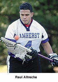 Raul Altreche, a goalkeeper on the Amherst College men's lacrosse squad, didn't begin playing team sports until high school, where he was introduced to football, wrestling and lacrosse.