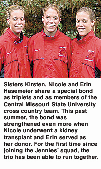 By their own admission, Central Missouri State University junior cross country student-athletes Kirsten, Erin and Nicole Hasemeier share a special bond. Not only are they sisters, they are identical triplets.