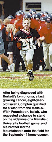 Arrangements were made for Isaiah and his younger brother to lead the Mountaineers onto the field and serve as water boys for the September 4 home opener, which also happened to be the fourth annual Josh Palmer Fund Pigskin Classic, a fund-raiser named for a former Mansfield football student-athlete, Josh Palmer, who overcame Hodgkin's disease. Palmer returned to the football field and later started a fund to assist other youth battling the disease.