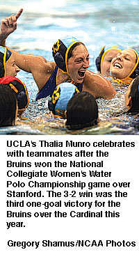 UCLA succeeded in its quest to finish the season undefeated, capturing the National Collegiate Women's Water Polo Championship May 15 at Michigan in a close match against Stanford. The Bruins bested the Cardinal, 3-2, capturing UCLA's third national championship in the tournament's five-year history.
