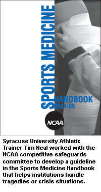 Indeed, the terrorist attacks on September 11, 2001, inspired Neal to create the "Catastrophic Incident in Athletics" guideline that appears in the NCAA Sports Medicine Handbook. Neal worked with the NCAA Committee on Competitive Safeguards and Medical Aspects of Sports to develop the information.