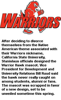 California State University, Stanislaus, retained its nickname, the Warriors, but moved away from using an American Indian mascot and logo. William Ruud, vice-president for development and university relations, said the institution is about to unveil a new mascot with a Middle Ages knight feel to it.