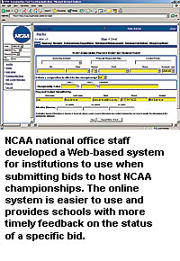 The Web-based process will be implemented this fall, replacing outdated and cumbersome hard-copy forms with more efficient and accurate technology. The new system applies to institutions in all three NCAA divisions, as well as other entities such as sports corporations or county sports authorities, interested in submitting a bid to host any round of NCAA championship competition.