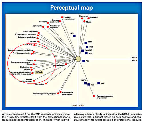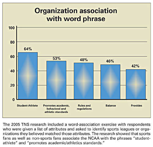 "In other words," he said, "you can strategize or develop ads that indicate a link with higher education, but you have to explain that the NCAA is a collection of different kinds of higher education institutions. In that way, you go from 'I am the NCAA,' or the student-athlete voice, to 'we are the NCAA,' more of a membership voice. The TNS research reveals a need for the NCAA to identify who it is."
