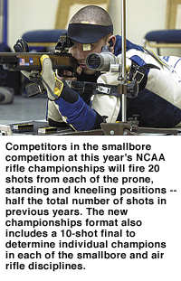 Previously, the course of fire during the championships included 120 shots in smallbore -- 40 shots each in the prone, standing and kneeling positions -- and 40 shots in air rifle. Beginning this year, competitors will shoot 60 shots in smallbore -- 20 shots each prone, standing and kneeling -- and complete a 60-shot air rifle match.